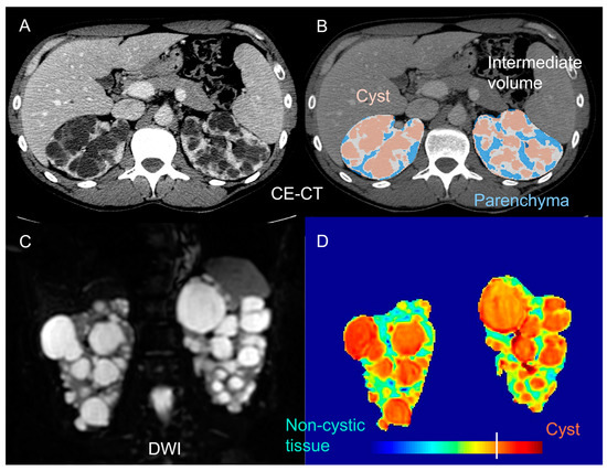 Beyond the total kidney and cyst volume, the quantification and characterization of the non-cystic kidney tissue component (Figure 4) has recently shown the potential to stratify ADPKD patients early, monitor disease progression, and possibly predict renal function loss [71,72,73,74].