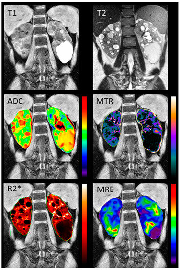 Examples of the multiparametric MRI of the kidney in a representative ADPKD patient. The top row shows structural MRI scans (T1- and T2-weighted). The second and third rows show quantitative maps, overlaid on the T1-weighted scan: the apparent diffusion coefficient ‘ADC’ derived from DWI, the magnetization transfer ratio ‘MTR’ derived from MTI, the apparent transverse relaxation rate ‘R2*’ derived from BOLD, and the tissue stiffness map derived from MRE. The figure was reprinted with permission from Kline, T.L. et al. Quantitative MRI of kidneys in renal disease [87].