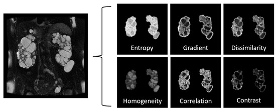 Radiomics, also known as texture analysis, is a growing field that uses advanced image analysis techniques to extract quantitative information from medical images. Texture analysis involves the measurement of various image features, such as the intensity, shape, and spatial distribution of image structures. These features can provide valuable information about the heterogeneity of the cystic and non-cystic tissue, and can help to distinguish between simple and complex (e.g., proteinaceous) cysts. In the context of ADPKD, radiomics has been used to extract textural features from radiological images (Figure 6), and to correlate these features with the clinical severity of the disease.