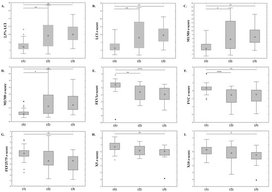 Differences in selected PFT parameters between three groups of patients distinguished by MRI classification: 2.5% LCI, F(2;68) = 10.386, and p < 0.001 (A); LCI z-score, F(2;6) = 10.376, and p < 0.001 (B); M1/M0 z-score, F(2;68) = 10.118, and p < 0.001 (C); M2/M0 z-score, F(2;68) = 8.41, and p < 0.001 (D); FEV1z-score, F(2;84) = 13.65, and p < 0.001 (E); FVC z-score, F(2;84) = 16.25, and p < 0.001 (F); FEF25/75 z-score, F(2;84) = 8.309, and p < 0.001 (G); X5 z-score, F(2;82) = 8.21, and p < 0.001 (H); X10 z-score, F(2;82) = 4.15, and p = 0.019 (I). Groups by MRI classification: no perfusion deficits (1), mild perfusion deficits (2), severe perfusion deficits (3). Analysis was performed using the Kruskal–Wallis one-way ANOVA; (○) outliers, (●) extreme outliers. Pairwise comparison with Dunn–Bonferroni test: p ≤ 0.05 (*); p ≤ 0.01 (**); p ≤ 0.0001 (****).