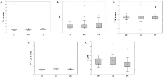 Differences in selected PFT parameters between three groups of patients distinguished by MRI classification: Fres z-score, F(2;82) = 0.546 and p = 0.581 (A); AX, F(2;82) = 0.309 and p = 0.735 (B); TLC z-score, F(2;74) = 0.668 and p = 0.516 (C); RV/TLC z-score, F(2;75) = 0.104, and p = 0.902 (D); SBCO TLCO, F(2;51) = 2.074 and p = 0.136 (E). Groups by MRI classification: no perfusion deficits (1), mild perfusion deficits (2), severe perfusion deficits (3). Analysis was performed using the Kruskal–Wallis one-way ANOVA; (○) outliers, (●) extreme outliers.