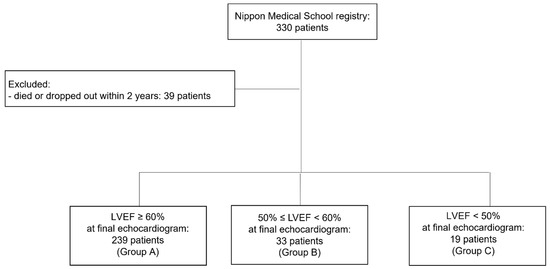 This single-center study included patients enrolled in our hospital’s HCM registry from 1 February 2009 to 31 December 2018. We analyzed the data of 291 patients with HCM after excluding patients who died or dropped out within 2 years (39 patients) (Figure 1). Patients were divided into three groups based on LVEF at the end of the study period: group A (LVEF of ≥60%), group B (LVEF of 50–59%), and group C (LVEF of <50%). We investigated predictors of an LVEF of <50% and 60%. The study protocol adhered to the principles of the Declaration of Helsinki and was approved by the Nippon Medical School Hospital Institutional Ethics Committee (O-2021-006). Informed consent was not required because of the retrospective study design.