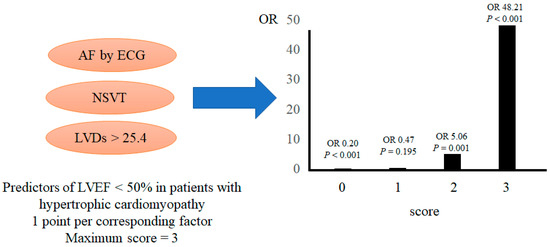Predictors of an LVEF of <50% in patients with hypertrophic cardiomyopathy. AF: atrial fibrillation; ECG: electrocardiogram; LVDs: left ventricular diameter at the end of systole; NSVT: nonsustained ventricular tachycardia; OR: odds ratio.