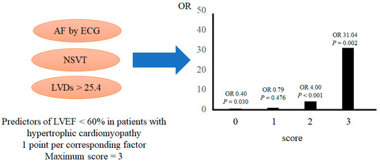 AF, NSVT, and LVDs were significant factors contributing to DHCM development according to the multivariate analysis (Table 2). Hence, we propose a scoring method based on the following three parameters: AF, NSVT, and LVDs of >25.4 mm, with 1 point assigned to each risk factor to determine the risk of developing DHCM or declining LVEF (<60%). Patients with 2 and 3 points had a significantly higher risk of developing DHCM (odds ratio (OR): 5.06; 95% confidence interval (CI): 1.95–13.10; p = 0.001 and OR: 48.21; 95% CI: 8.59–270.76; p < 0.001, respectively) (Figure 2). The risk of declining LVEF (<60%) was significantly associated with 2 and 3 points (OR: 4.00; 95% CI: 2.09–7.69; p < 0.001 and OR: 31.04; 95% CI: 3.65–263.96; p = 0.002, respectively) (Figure 3).