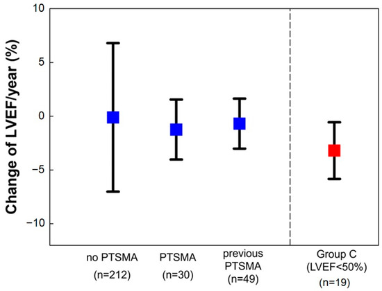 Patients were divided into three groups based on the study period to investigate the effects of PTSMA on the rate of declining LVEF (ΔLVEF/year): PTSMA before the study period (n = 49), PTSMA during the study period (n = 30), and no PTSMA (n = 212). The rate of LVEF decline/year did not differ between the three groups (Figure 4).