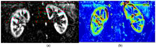 A fairly new MRI method to study renal perfusion is arterial spin labelling (ASL), which utilises radiofrequency (RF) pulses to alter the longitudinal magnetisation of water in the blood into a diffusible endogenous tracer []. A flow-sensitised “label” (or tag) image is acquired after a time delay to ensure the arrival of “labelled” blood to the renal tissue microvasculature. This image acquisition is then repeated to obtain a “control” image without altering the magnetisation of the inflowing blood. As the static tissue spins have the same magnetisation preparation; the difference in the signal of inflowing blood is only due to a different preparation, and subtracting the two resulting images yields a perfusion-weighted image (PWI) []. These PWIs are then fed into a model that describes the relationship between the difference in the signal and the actual blood perfusion. The result is a quantitative perfusion map (RBF) with units mL/100 g of tissue/min []. Different variants of ASL, such as continuous (CASL), pulsed (PASL), and pseudo-continuous (PCASL) [,], can be used to invert the arterial blood magnetization and obtain the renal tissue’s perfusion. Figure 1 shows an example of the ASL perfusion weighted image (left panel) and the resulting renal blood flow map (right panel) using the CASL technique.