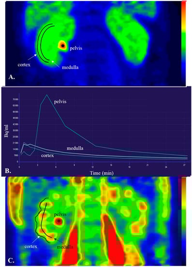(A,B) Show an “early” scan immediately after [18F]FDG injection and the time–activity curves in the renal cortex, medulla and pelvis. Notice that [18F]FDG quickly reaches the renal pelvis (Figure 1b). (C) Shows a “late” scan acquired ~60 min after [18F]FDG injection. Data from the same subject are shown.