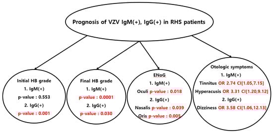 In the context of VZV infection, VZV Ig refers to the specific antibodies produced by the immune system in response to the presence of the varicella-zoster virus. These antibodies, including IgM and IgG, play a critical role in detecting and neutralizing the virus, aiding in the diagnosis and management of VZV-related diseases. Several studies have been conducted so far regarding the long-term prognosis of facial paralysis and accompanying symptoms in patients with RHS. According to one previous study, the prognosis of facial paralysis was worse in patients with RHS, who were old, had hypertension or diabetes mellitus as an underlying disease, and had dizziness as a comorbidity [16]. In another previous study, it was reported that the higher the neutrophil-to-lymphocyte ratio and neutrophil count before high-dose steroid treatment in patients with RHS, the poorer the prognosis of facial paralysis. A high neutrophil-to-lymphocyte ratio and neutrophil count mean that the body’s immune response is actively occurring, and through this, it can be confirmed that the inflammatory response to VZV in the facial nerve sheath plays an important role in the development of facial paralysis in RHS. In addition, it was deduced that the more inflammatory reactions occur, the poorer the prognosis of patients with RHS [17]. As such, although many studies have been conducted on the prognostic factors of RHS, studies on VZV IgM and IgG antibodies, which have a direct immune response against VZV, have not been conducted so far.