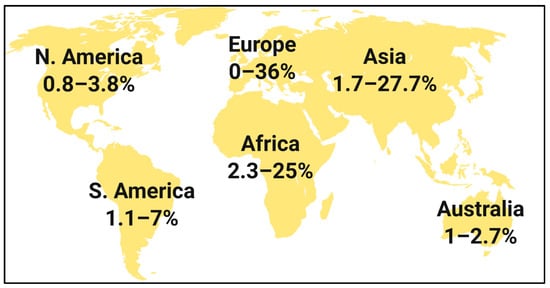 In the 21st century, numerous epidemiological studies of drug susceptibility of the most common uropathogens were conducted. Figure 1 summarizes the resistance rate to nitrofurantoin among strains of E. coli causing UTI. The results come from studies performed in different regions of the world, in different periods, and in groups of different sizes [2,7,8,10,13,15,16,17,18,19,20,21,30,31,32,33,34,35,36,37,38,39,40,41,42]. In most cases, the percentage of resistance to nitrofurantoin was low and often did not exceed 3%. However, in some cases, the observed resistance exceeded 20% (Cameroon, 2014; Ethiopia 2015–16; Pakistan 2019–20; India, 2016) [15,19,21,38] and, notably, even exceeded 30% in Poland, 2013 [8].