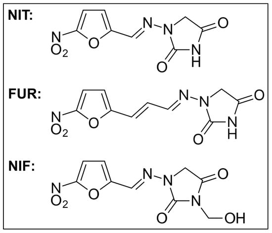 Structural chemical formulas of nitrofurantoin (NIT), furazidin (FUR), and nifurtoinol (NIF).