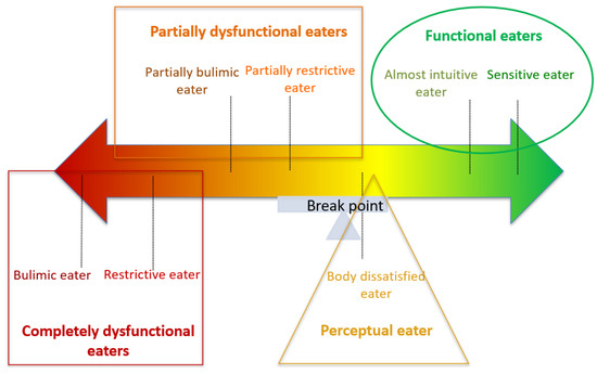 In summary, the “completely dysfunctional eaters”, present a disconnection between body and eating attitudes and behaviors that, together with high body dissatisfaction, may have led to a self-perpetuating dysfunctional cycle of restraint and bulimic attitudes and behaviors. The “bulimic eater” and the “restrictive eater” already have clinical symptoms related to eating pathology. These two eaters require comprehensive assessment and prompt treatment interventions, as they may meet the diagnostic criteria for eating disorders or subthreshold and partial eating disorders. From an interventional perspective, eaters in this category could benefit from the well-validated Cognitive Behavioral Therapy and Eating Disorders (CBT-E) [74]. This approach provides an account of the “transdiagnostic” theory that overlaps different types of eaters, which may be particularly appropriate for our dimensional approach to eaters profiles.
