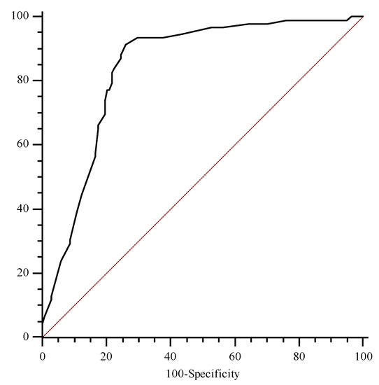 To define the optimal diagnostic cut-off for MR-proADM values to detect sepsis in our cohort, we performed an ROC analysis including only data from patients affected by sepsis or septic shock. The ROC analysis was performed with CRP and PCT. The AUC for MR-proADM on admission was 0.88 with the best cut-off at 5.1 nmol/L, determining a sensitivity and a specificity of 78.5% and 85%, respectively.