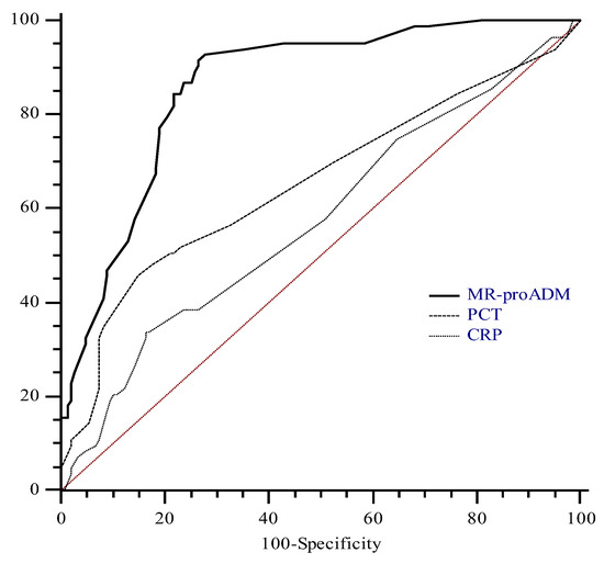 Receiver operating characteristics curves of mid-regional pro-adrenomedullin (MR-proADM), procalcitonin (PCT), and C-reactive protein (CRP) considering diagnosis of sepsis as status variable. MR-proADM area was significantly different from that of PCT (p < 0.0001) and CRP (p < 0.0001). On the contrary, the difference between PCT and CRP areas was not significant (p: 0.17).