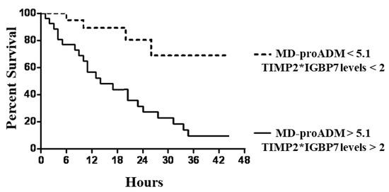 Kaplan–Meier survival curves of endpoint in patients with combined tissue inhibitor metal proteinase-2*insulin growth factor binding protein-7 (TIMP2*IGBP7) and mid-regional pro-adrenomedullin (MR-proADM) levels above and below the optimal receiver operating characteristic cut-off levels of 2 mg/L and 5.1 nmol/L.