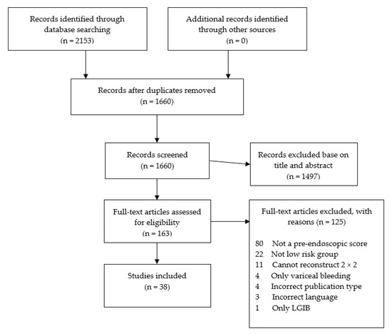 Overall, 2153 citations were retrieved; 1497 were rejected based on titles and abstracts, 163 articles were fully reviewed, and 38 studies (n = 36,215 patients) were included (PRISMA diagram, Figure 1). Fourteen studies (n = 7958 patients) assessed GBS [19,20,21,22,23,24,25,26,27,28,29,30,31], 4 assessed CRS (n = 1890 patients) [32,33,34,35], 3 assessed AIMS65 (n = 1340 patients) [36,37,38] and 1 study assessed the ABC score (n = 2020) [39]. Six studies reported results for both the GBS and CRS (n = 2774 patients) [3,40,41,42,43,44], three reported both GBS and AIMS65 (n = 1372 patients) [45,46,47] and one assessed GBS and the The Haemoglobin-Urea-Pulse-Systolic blood pressure score (HUPS) (n = 934 patients) [48]. The remaining six studies assessed multiple risk scores (n = 17,816 patients) [8,14,49,50,51,52]. Table 2 details the included studies. Only scoring systems that had at least three fully published validation studies were included in the results while the others were included only in the supplementary Table S2. Study quality scores using the NOS ranged from 5 to 7 stars out of a possible score of 9, with a mean of 6.6 ± 0.9. Assessing the individual domains of the NOS confirmed the low quality of the studies (Supplementary Table S3). No publication bias was observed (data available upon request).