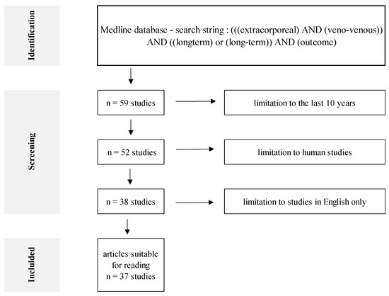 The search of the Medline database was performed on 25 May 2023 using the advanced search option and the following search keywords: (((extracorporeal) AND (veno-venous)) AND ((longterm) or (long-term)) AND (outcome). The search was limited to the last 10 years; only human studies written in English were included. In total, 37 results were identified for retrieval and full evaluation (Figure 1). All search results, including abstracts, were exported into an external file for further analysis (Supplementary Materials). Two researchers independently read all the identified papers. Only papers containing significant information on the topic are referred to in this review.