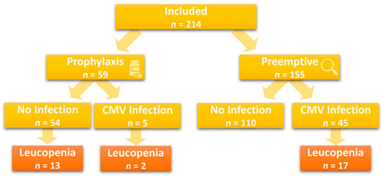 - Green, M.L.; Leisenring, W.; Stachel, D.; Pergam, S.A.; Sandmaier, B.M.; Wald, A.; Corey, L.; Boeckh, M. Efficacy of a Viral Load-Based, Risk-Adapted, Preemptive Treatment Strategy for Prevention of Cytomegalovirus Disease after Hematopoietic Cell Transplantation. Biol. Blood Marrow Transplant. 2012, 18, 1687–1699. [Google Scholar] [CrossRef] [PubMed]