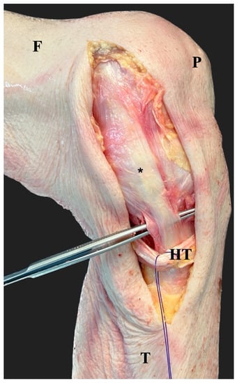 After the incision of the skin and the subcutaneous tissue, the fascia was incised in line with the skin incision. The hamstring tendons (HT) were preserved and the superficial medial collateral ligament (*) was identified. The forceps indicates the most distal part of the superficial medial collateral ligament. F, femur; T, tibia; P, patella.