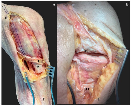 After identifying the superficial medial collateral ligament insertion underneath the hamstring tendons (HT), the tibial insertion osteotomized to a bone block with a length of 3 cm, a width of 1.5 cm and a thickness of 1 cm (*) (A). Then, the superficial medial collateral ligament was elevated proximally, together with the sharply detached deep MCL and the medial meniscus (M). Thereafter, the submeniscal arthrotomy was extended anteriorly and posteriorly to visualize the medial articular surface (B). F, femur; T, tibia.