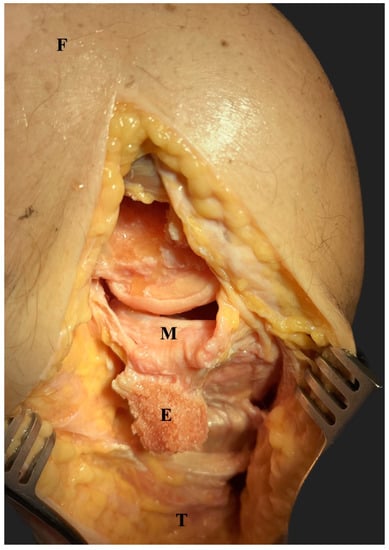 - Peez, C.; Wermers, J.; Glasbrenner, J.; Briese, T.; Raschke, M.J.; Herbst, E.; Kittl, C. Qualitative and Quantitative Assessment of the Medial Patellar Retinaculum Anatomy: The Anteromedial Side of the Knee Revisited. Orthop. J. Sports Med. 2022, 10, 23259671221134818. [Google Scholar] [CrossRef] [PubMed]