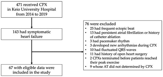 During the study period (from 2014 to 2019), 471 patients underwent CPX in Keio University Hospital. Then, 143 patients with symptomatic heart failure were enrolled in this study after excluding 328 patients who had myocardial infarction or atrial fibrillation or underwent CPXs due to the assessment of shortness of breath. Furthermore, seventy-six patients were excluded from this study because of frequent ectopic beats (n = 25), concomitant atrial fibrillation or history of catheter ablation for atrial fibrillation (n = 13), pacemaker rhythm (n = 3), onset of new arrythmia during exercise (n = 3), fluctuated QRS wave (n = 10), history of open-heart surgery (n = 11), and respiratory quotient <1.05 in symptom-limited peak exercise (n = 2). We also excluded nine patients whose AT was not determined by CPX. Finally, 67 patients were included in the present study (Figure 1).