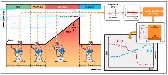 Cardiopulmonary exercise testing protocol and the methods of power spectrum analysis of heart rate variability. ECG, electrocardiogram; HR, heart rate; HFC, high-frequency component.