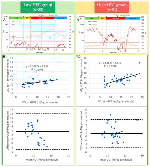 (A1,A2) Quantitative imaging of the power spectrum of heart rate variability (HRV) during incremental exercise. A representative graph of the high-frequency component (HFC) (red) and heart rate (HR; orange) with an RAMP (15 W/min) protocol ergometer is shown in the low-HFC (A1) and high-HFC groups (A2), respectively. (B1,B2) Validity testing of the oxygen uptake (VO2) at the HRV threshold (HRVT) and anaerobic threshold (AT) in the low-HFC (B1) and high-HFC groups (B2). The graph in the upper panel shows the relationship between each VO2 at the HRVT and AT, and that in the lower panel shows the Bland-Altman plots, which indicate the respective differences between each VO2 at the HRVT and AT (y-axis) for each individual against the mean of the VO2 at the HRVT and AT (x-axis). The dark line in the Bland-Altman plot represent a ± 1.96 standard deviation.