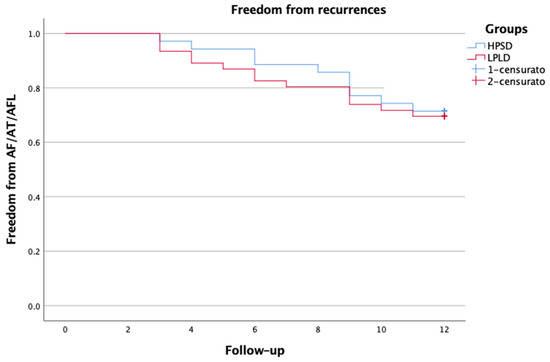 A total of 35 patients with symptomatic Pe-AF were consecutively included in the study. The baseline clinical characteristics of the patient population are reported in Table 1. All patients underwent at least one attempt of electric cardioversion before the procedure. The procedural characteristics are reported in Table 2. In all cases, PWI guided by LSI using HPSD settings was performed after PVI. First-pass PVI was achieved in 93.3% of PVs (n = 126/135). First-pass roofline block was obtained in most patients (n = 31, 88.5%), while first-pass block of the bottom line was only achieved in 51.4% (n = 18). When comparing the HPSD group to a control group of patients in which PWI was performed with low-power long-duration ablation (30–35 W), there were no significant differences; first-pass PVI was achieved in 94.9% of PVs (n = 169/178), first-pass roofline block in 89.1%, and bottom-line in 45.6% of patients (p = ns). Scattered RF applications—in HPSD—within the PW were delivered to achieve complete PWI. We did not observe electrical reconnection of the PW after the waiting period and adenosine administration. Procedure and RF times were significantly shorter in the HPSD group compared to the control group, with values of 116.2 ± 10.9 vs. 144.5 ± 11.3 min, and 19.8 ± 3.6 vs. 26.3 ± 6.4 min, respectively, p < 0.001 (Table 3). Fluoroscopy time was comparable between both groups. No procedural complications related to HPSD settings were observed. One patient had a vascular complication but did not require surgery. The mean length of hospital stay was 2 ± 1.2 days. At the 12-month follow-up, 71.4% of patients remained free from atrial arrhythmia. There were no significant differences compared to the historical control group (71.4% vs. 69.5%, p = ns) (Figure 3). At the 1-year follow-up, 31.5% of patients were on AADs. Post-procedural AF burden was significantly decreased from 89% to 22% (p < 0.0001).