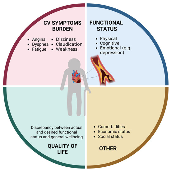 Frailty is a complex age-related condition frequently experienced by older adults with CVD, and is associated with a high risk of negative outcomes [5]. Although there is no univocal operational definition of the condition, frailty can be conceived as a syndrome with multiple causes and contributors that is characterized by diminished strength, endurance, and reduced functional reserve that increases an individual’s vulnerability to develop dependency and/or die [6]. Thus, the assessment of frailty is expected to provide relevant information to guide therapeutic decision-making and follow-up (Figure 2).