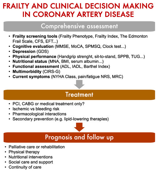 Screening for frailty is essential to guide clinical decision-making in older adults with coronary artery disease. Abbreviations: BMI: Body Mass Index; CABG: Coronary Artery Bypass Grafting; CFS: Clinical Frailty Scale; CIRS-G: Cumulative Illness Rating Scale-Geriatric; EFT: Essential Frailty Toolset; GDS: Geriatric Depression Scale; MMSE: Mini Mental State Examination; MNA: Mini Nutritional Assessment; MoCA: Montreal Cognitive Assessment; MRC: Medical Research Council Dyspnoea Scale; NRS: Numerical Rating Scale; NYHA: New York Heart Association; PCI: Percutaneous Coronary Intervention; SPMSQ: Short Portable Mental State Questionnaire; SPPB: Short Physical Performance Battery; TUG: Timed Up and Go Test.