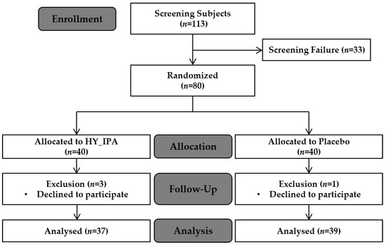 | Variable | HY_IPA (N = 37) | Placebo (N = 39) | p-Value | ||||