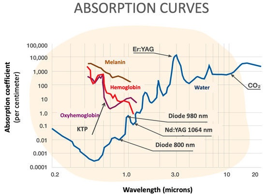 Approximately 20 years ago, and as a new parallel field for properties other than laser cutting, photoangiolytic laser surgery was developed. This type of laser included PDL (pulsed dye laser), at a 585 nm wavelength [4,5,6], or KTP (potassium titanyl phosphate), at a 532 nm wavelength [7,8,9] (Figure 1). They routed through flexible glass fibers into flexible channeled endoscopes, expanding the therapeutic armamentarium in a new way by specifically targeting vascularized endolaryngeal lesions.