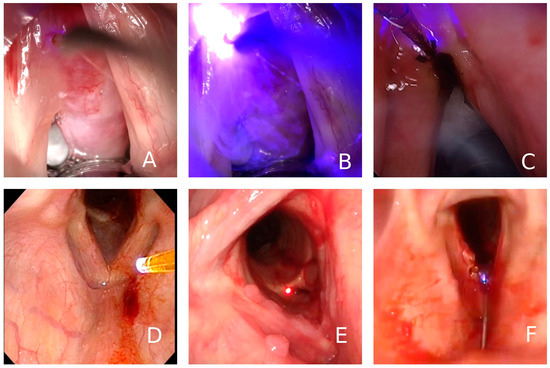 - Campos, G.; Amaya, O.; Valencia, J.; Arango, L. Transoral flexible laser surgery of the upper aerodigestive tract with blue laser. Eur. Arch. Otorhinolaryngol. 2023, 280, 765–774. [Google Scholar] [CrossRef]