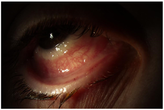 Upon presentation to the pediatric eye clinic three months after the commencement of infliximab, the patient complained of painful, red eyes with epiphora and reduced vision. Visual acuity was 6/15 unaided (no improvement with pinhole—NIPH) in the right eye and 6/9 unaided (6/6 with pinhole) in the left eye. Intraocular pressure was 17 mmHg in the right eye and 18 mmHg in the left eye. Refraction of the right eye was +0.25/+1.25 × 81°, and the left eye was −9.00/+6.00 × 87°. A scissoring reflex was seen on the retinoscopy of the left eye. Central corneal thickness was 547 µm in the right eye and 537 µm in the left eye with pachymetry. There was meibomian gland dysfunction, which was worse in the left eye, and a mechanical ptosis from lid swelling. There was significant tarsal conjunctival inflammation on the left lower lid, with an area of ulceration measuring 1 cm with fluorescein uptake. Prominent corneal nerves and moderate superficial punctate epithelial erosions were noted on both corneas, but there was no ulceration. The anterior chambers were quiet, and the lenses were clear. The dilated fundal exam was normal. The systems review was notable for gastrointestinal distress and altered bowel habits. No urinary or respiratory symptoms were present. There was no mucosal inflammation or ulceration in areas other than the conjunctiva and gastrointestinal tract. There was no associated joint pain or rash. Viral (HSV1/2, VZV, Adenovirus) and bacterial swabs (MC + S, Chlamydia, and Gonorrhea) were taken, and the patient was started on Fucithalmic ointment (three times daily), dexamethasone preservative free drops (Dexafree) three times a day, and regular lubricants.