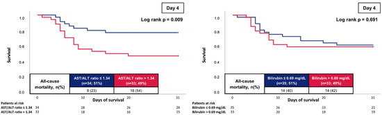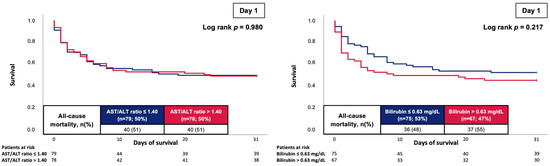 At 30 days, the primary endpoint of all-cause mortality occurred in 51% of the patients with an AST/ALT ratio of ≤1.40 (median on day 1) and in 51% of the patients with an AST/ALT ratio of >1.40. Accordingly, the risk of all-cause mortality was not affected by the baseline AST/ALT ratio (log rank p = 0.980; HR = 1.005; 95% CI 0.649–1.558; p = 0.981) (Figure 2, left panel). In line, no association of the baseline bilirubin with the risk of 30-day all-cause mortality was shown (55% vs. 48%; log rank p = 0.217; HR = 1.320; 95% CI 0.834–2.090; p = 0.236) (Figure 2, right panel).