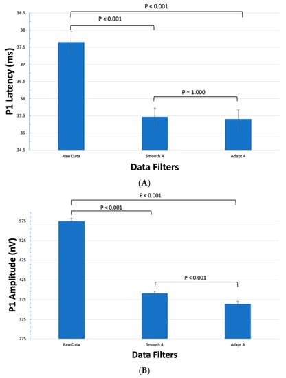 In order to perform statistical analysis, IBM SPSS Statistical Software 29 (IBM Corp. Armonk, NY, USA) was utilized. The mean, standard error, and 95% confidence interval were calculated for P1 latency and P1 amplitude for raw data, Smooth 4, and Adapt 4 groups. A one-way repeated measures ANOVA was used for simultaneous comparisons between the 3 groups. A p value < 0.05 was used to determine statistical significance of pairwise comparisons.
