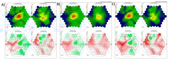 Representative normal reference (top) and normal deviation plots (bottom) from a single patient demonstrating the effects of filtering on these plots: (A) no filter, (B) smooth level 4, and (C) adaptive filtering level 4 on the patients right and left eye respectively.