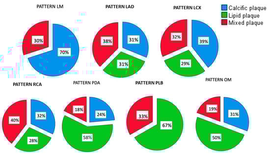 Distribution of plaque pattern type in LM, LAD, RCA, LCx, OM, PDA and PLB. The green part of every diagram represents the subgroup percentages for lipidic plaque, the red one for the mixed plaque and the blue one for the calcific plaque.