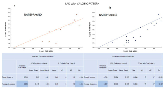 Significant (p value <0.05) and high concordance between the mean values of radiologists and the mean values found by cardiologists measuring the stenosis of calcific plaque in LAD in both groups: (a) non-NTG and (b) NTG.