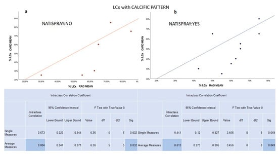 (a) In non-NTG group, the graph shows a significant and high concordance between radiologists and cardiologists in evaluating the percentage of stenosis for calcific plaques in LCx. (b) In NTG group, the graph shows a significant and medium concordance between radiologists and cardiologists in evaluating the percentage of stenosis for calcific plaques in LCx.