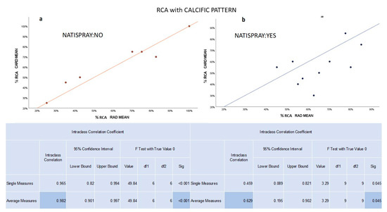 (a) In the non-NTG group, the graph shows a significant and very high concordance between radiologists and cardiologists in evaluating the percentage of stenosis for calcific plaques in RCA. (b) In the NTG group, the graph shows a significant and medium concordance between radiologists and cardiologists in evaluating the percentage of stenosis for calcific plaques in RCA.