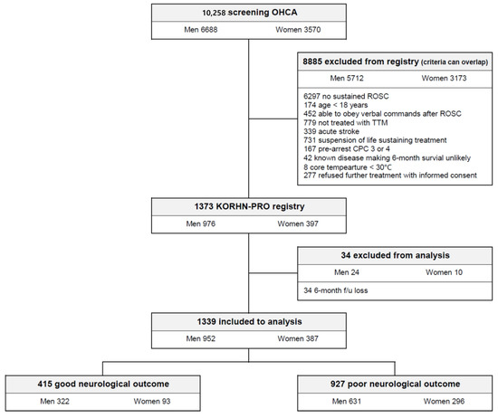 - Oh, S.H.; Park, K.N.; Lim, J.; Choi, S.P.; Oh, J.S.; Cho, I.S.; Lee, B.K.; Kim, Y.H.; Kim, Y.M.; Kim, H.J.; et al. The impact of sex and age on neurological outcomes in out-of-hospital cardiac arrest patients with targeted temperature management. Crit. Care 2017, 21, 272. [Google Scholar] [CrossRef]