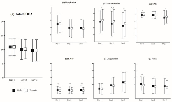Differences in daily in-hospital SOFA scores between men and women. (a) Differences in the daily total SOFA score. (b) Differences in the daily sub-score of respiration SOFA, (c) coagulation SOFA, (d) liver SOFA, (e) cardiovascular SOFA, (f) CNS SOFA, and (g) renal SOFA. SOFA score curves show the means and standard deviations. * p < 0.05 in student t-test. † p < 0.05 in analysis of covariance. Abbreviations: SOFA, Sequential Organ Failure Assessment; CNS, central nervous system.