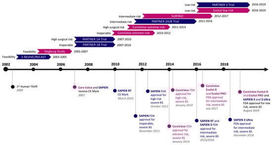 Timeline of milestone trials and FDA approvals for the use of TAVR in patients with severe aortic valve stenosis [15].