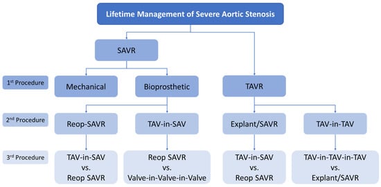 Another important factor when evaluating TAVR in young patients is to consider the possibility of future procedures, such as repeat valve replacement or coronary access for diagnostic or interventional procedures. This concept of “lifetime management” should be considered when determining the optimal treatment approach for the initial procedure. The expanding use of valve-in-valve (VIV) procedures has provided additional options for second and third valve replacement procedures. It is our opinion that the highest-risk procedure should be performed first while the patients are still young to minimize the need for surgical interventions in older and higher-risk patients in the future [38]. Careful evaluation and planning on the order and sequence of treatment options is essential (Figure 2) [39,40,41,42].