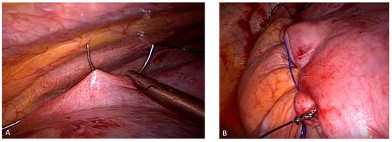 Plication of the diaphragm on itself (A: the first suture) after creating an inverted fold towards the abdominal cavity using nonabsorbable sutures (B: complete plication).