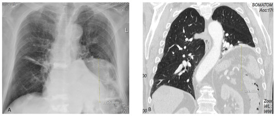 Between January 2008 and December 2022, 142 patients with symptomatic diaphragmatic eventration (DE) were enrolled in the current study. Five patients were excluded from surgery due to serious comorbidity (advanced lung fibrosis: n = 3, advanced neurological diseases: n = 2). Three patients were excluded from the study due to incomplete data. All patients (n = 134) who underwent diaphragmatic plication during the study period were retrospectively analyzed. The cohort included 94 (70%) males, mean age was 64 (SD ± 14.0) years. CXR showed an elevated diaphragm on one side in all patients and on both sides in two patients (1.4%) with displacement up to 12 cm (Figure 2). The diagnosis of the elevated diaphragm was confirmed in all patients for more than 2 years in 29 patients (22%), between 1–2 years in 45 patients (33%), and <1 year in 60 (45%).