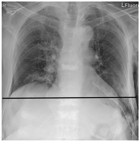 Postoperative chest X-ray after plication of the left side of the diaphragm. The black line demonstrates the new level after the plication of the left cupola.