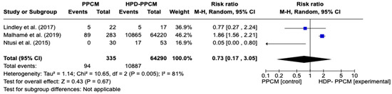 Similar to tobacco use analysis, three studies (Lindley et al., Ntusi et al., and Malhame et al.) [15,21,22] included an analysis of baseline history of chronic hypertension in their studies. Figure 3 reveals that chronic hypertension was more likely to influence the PPCM group rather than the HPD-PPCM group (RR = 0.73) [95% CI; 0.17,3.05, p = 0.67], which may favor diseases’ outcomes, although not significant. A high heterogeneity was also identified (I2 = 81%, p = 0.005).
