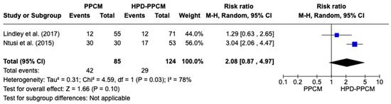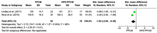 Forest plot of the impact of PPCM vs. HPD-PPCM on LV dilation [15,22].